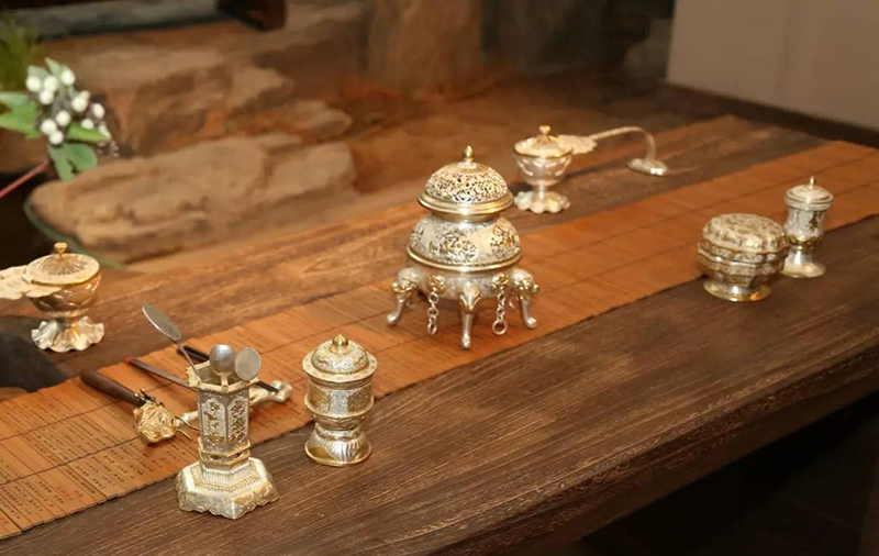 本次香席所用整套香具为中国民俗学会中国香文化研究中心孙亮主任参照法门寺出土的唐代香具一比一纯金银手工打造而成,分别有五足帝王熏香炉、手持香炉、香宝子、香盒、香瓶等,整套器具精致华丽,生动重现了中国盛唐时期皇家贵族的香席风采。