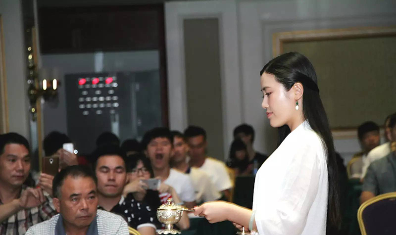 伴着悠远清灵的古琴声,行香师仙子、灵儿手持银柄香炉开始了首场巡香,所行之处,香气袅袅上升,满室弥散,给予在座宾客香友至高的欢迎之情。巡香过后,谢福有会长使用帝王炉开始了煎香仪轨。此次香品为谢福有会长收藏的海南野生黑奇楠,一炉清香过后,已达身心俱清净。