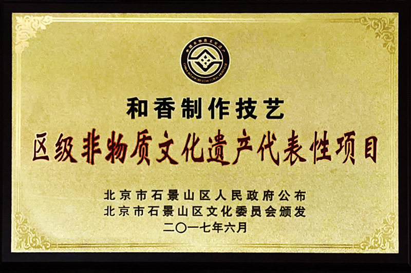 “中国香文化中心”荣膺石景山区非物质文化遗产和香制作技艺项目保护单位,和香制作技艺获区级非物质文化遗产代表性项目称号。