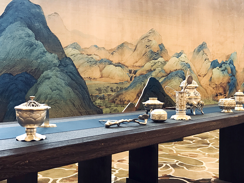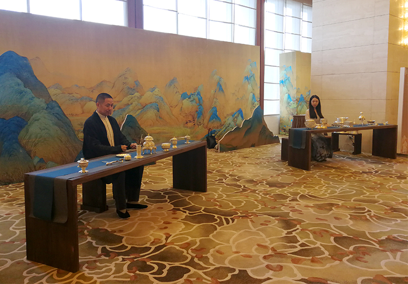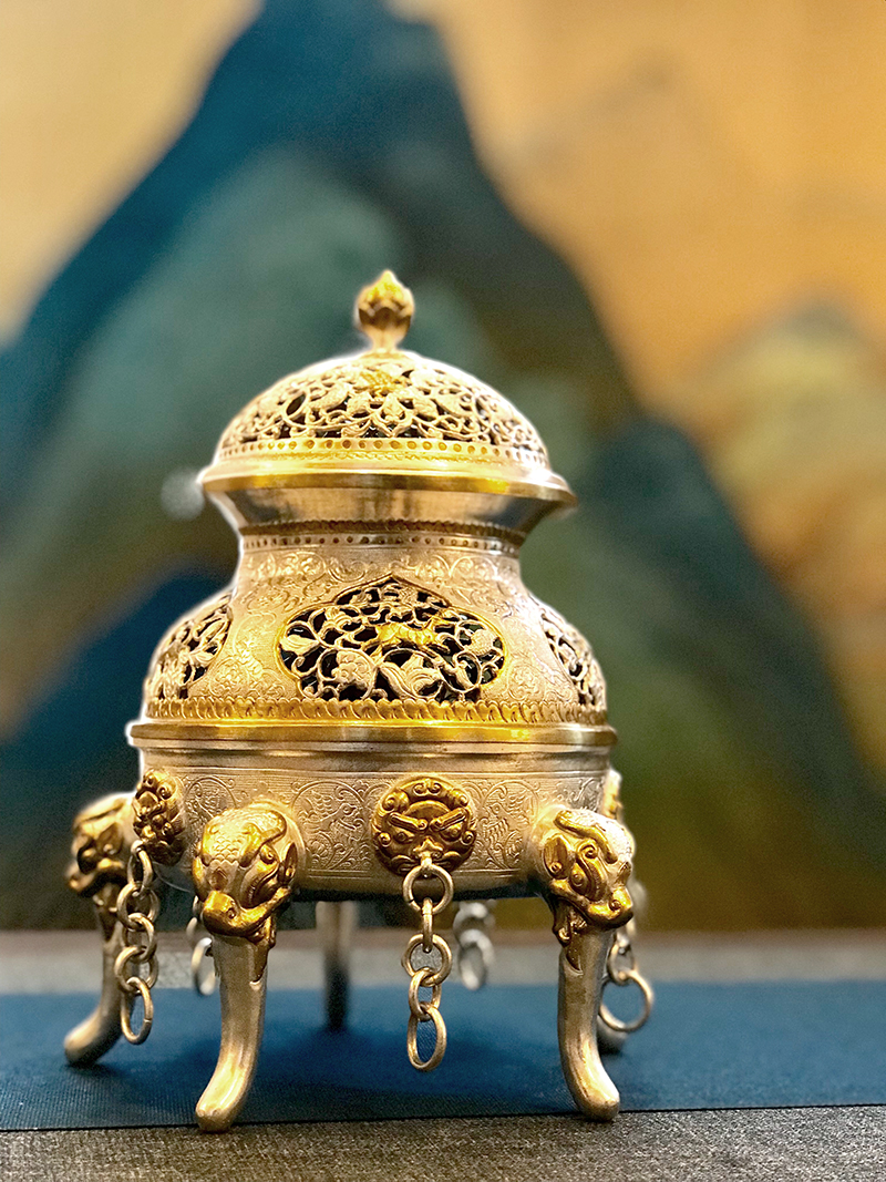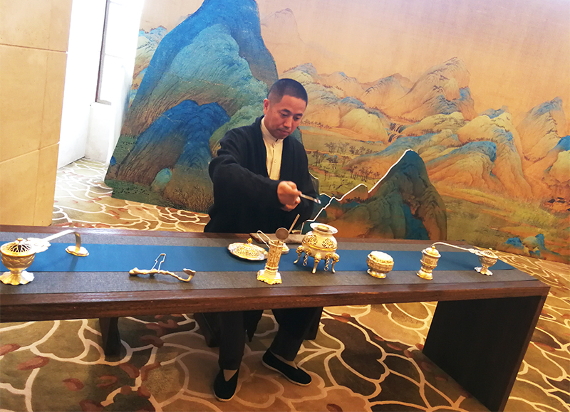 焚香所用器具是用金银器錾刻工艺复原的唐代宫廷器物,采用国家级非物质文化遗产“金银细工制作技艺”完成。