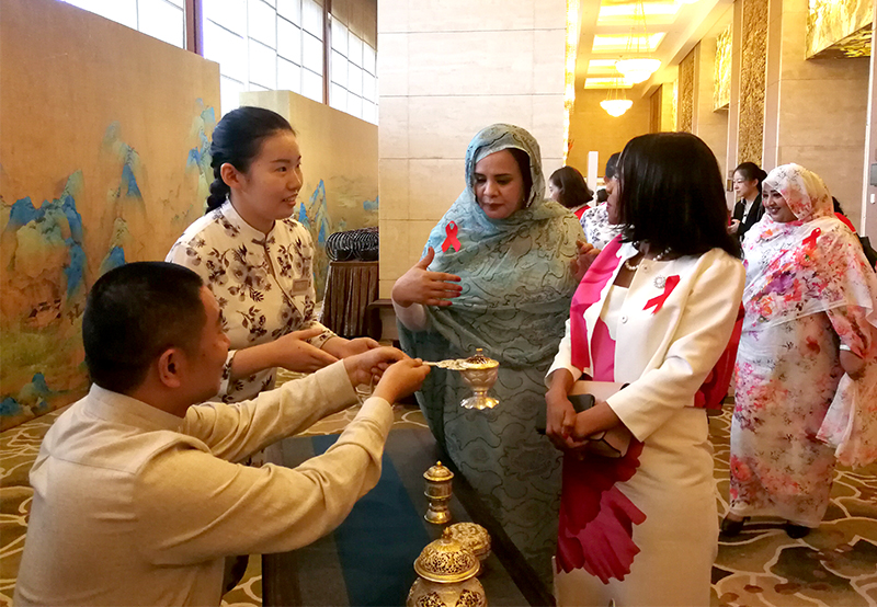 2018年9月4日,国家主席习近平夫人彭丽媛在钓鱼台国宾馆芳华苑出席“中非携手抗艾·共享美好未来”主题会议并发表致辞,与来华参加中非合作论坛北京峰会的37位非洲国家元首、政府首脑夫人共同发布《中非艾滋病防控主题会议联合倡议》。会后,彭丽媛与外方嘉宾共同欣赏了中国非物质文化遗产展示。