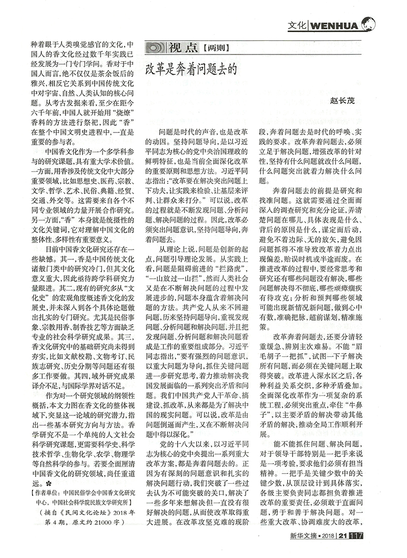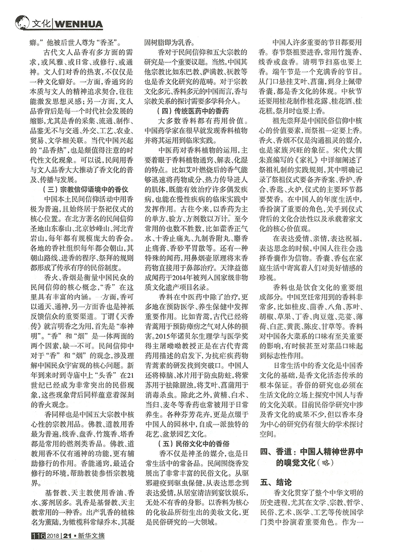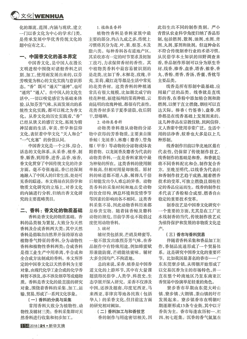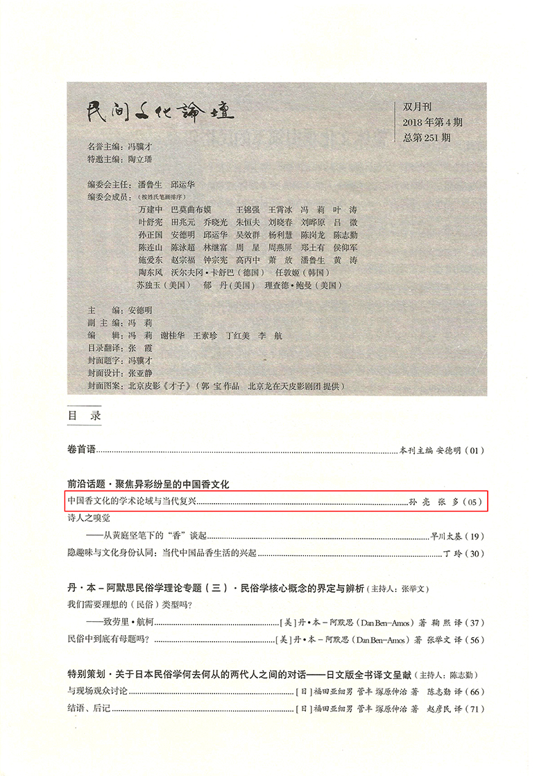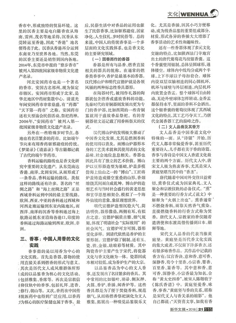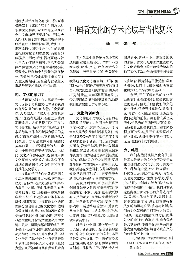 近日,由中国民俗学会中国香文化研究中心孙亮主任和中国社会科学院民族文学研究所张多博士合作撰写的学术论文《中国香文化的学术论域与当代复兴》(《民间文化论坛》2018年第4期),被国家权威文摘期刊《新华文摘》2018年第21期大篇幅转载。这是中国香文化研究中心成果在学术界产生广泛影响的重要标志。