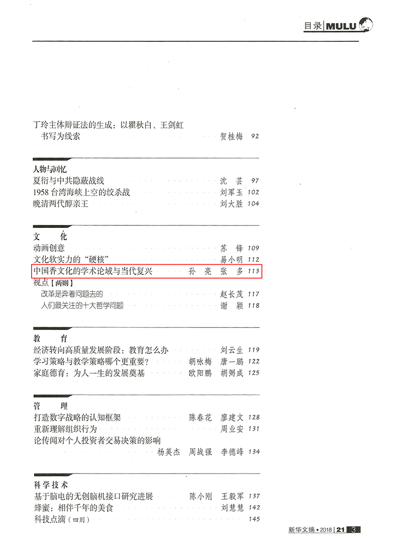 我国学术界公认的权威二次文献有四种,人民出版社主办的《新华文摘》、中国社会科学院主办的《中国社会科学文摘》、中国人民大学主办的《人大报刊复印资料》以及上海师范大学主办的《高等学校文科学术文摘》。能够被这四种期刊转载的论文,通常都是质量高、影响大、前沿新颖、对社会发展有重要意义的文章。此次中国香文化研究中心的成果被“四大文摘”之首的《新华文摘》转载,殊为不易,实为中心学术研究的又一突破。