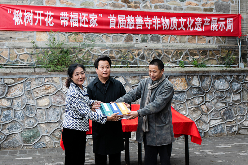 中国民俗学会中国香文化研究中心主任孙亮向慈善寺文保所和石景山区非物质文化遗产保护中心赠送“古道凝香”系列产品