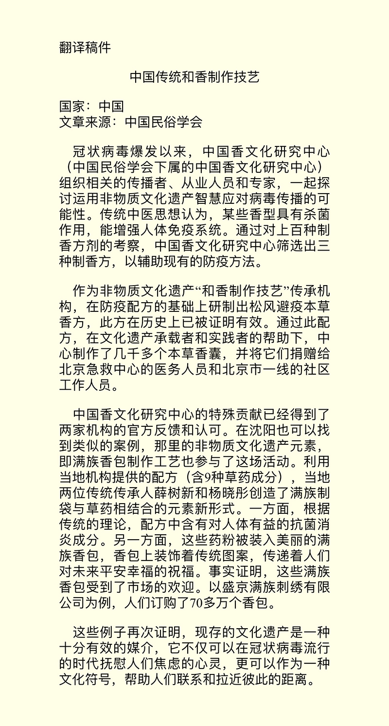 收到邮件后学会相关机构实践报送教科文组织,中国民俗学会中国香文化研究中心作为石景山区非物质文化遗产“和香制作技艺”的传承机构,在防疫配方的基础上研制出松风避疫本草香方,中心据方生产了几千个草药香囊,并通过中国红十字会捐赠给北京急救中心的医务人员和北京市的社区工作者。