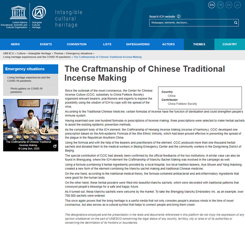 学会将此工作作为一个实践案例提交给教科文组织秘书处,中国香文化研究中心所做的工作得到了联合国教科文组织的认可!并将此案例分享在教科文组织的官方网站上。
