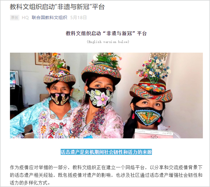 教科文组织邀请其合作伙伴分享他们在疫情大爆发期间活态遗产的作用以及近期如何影响其保护的经验,有助于在COVID-19的背景下增进对保护活态遗产的了解,并激发社区相互学习和交流经验。