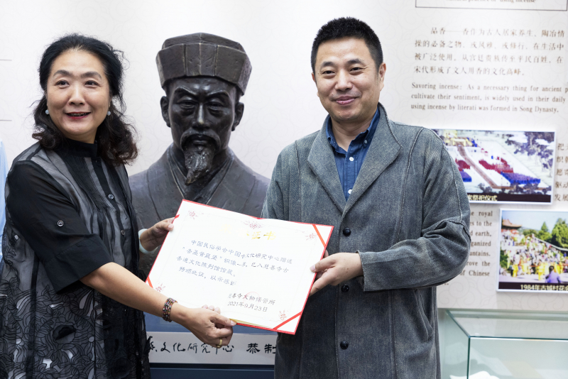 由中国民俗学会中国香文化研究中心赠送的"香圣黄庭坚"铜像,已入慈善寺古香道文化陈列馆馆藏。慈善寺文物保管所所长赵冬梅向中国香文化研究中心主任孙亮颁发收藏证书。