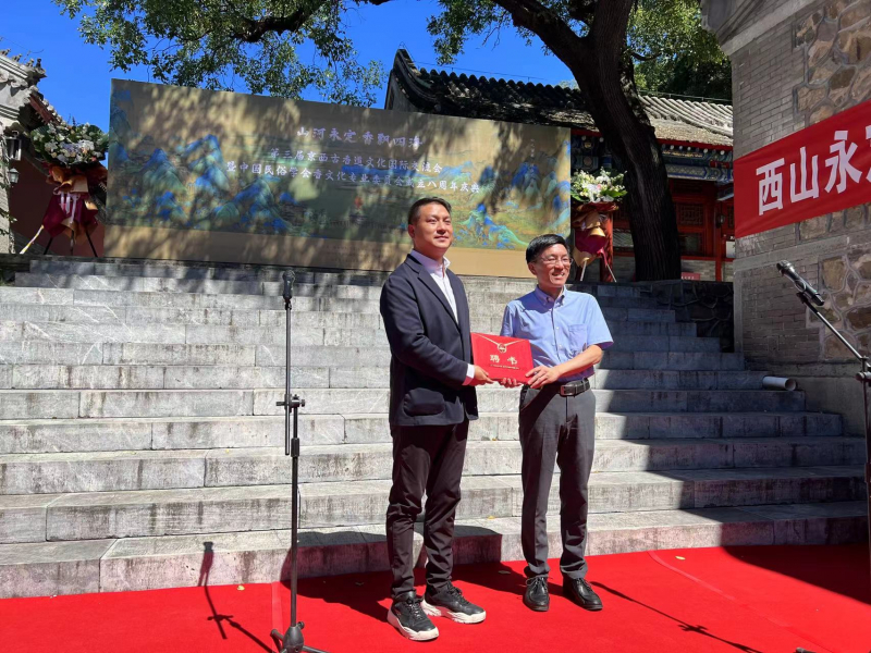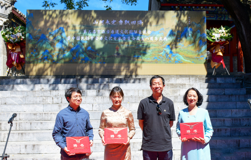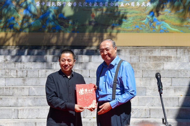 中国民俗学会荣誉会长朝戈金为孙亮颁发荣誉证书,鉴于孙亮先生在中国香文化传承和发展中做出的突出贡献,授予中国民俗学会香文化专业委员会荣誉主任。