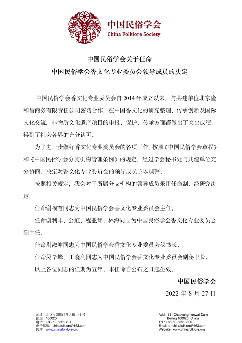 2022 年 8 月 27 日中国民俗学会副会长兼秘书长施爱东宣读《中国民俗学会关于任命中国民俗学会香文化专业委员会领导成员的决定》。