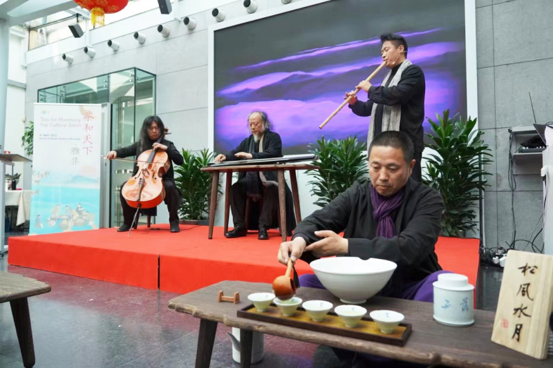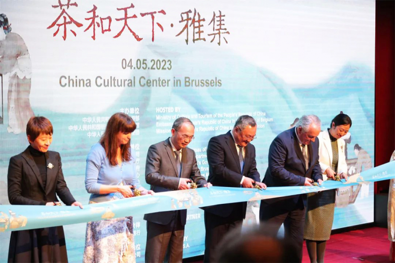 中国驻欧盟使团团长傅聪、中国驻比利时大使曹忠明、北京文化艺术传承发展中心主任姜婷婷等中外嘉宾代表共同为此次“茶和天下”·雅集主题展开幕式剪彩。