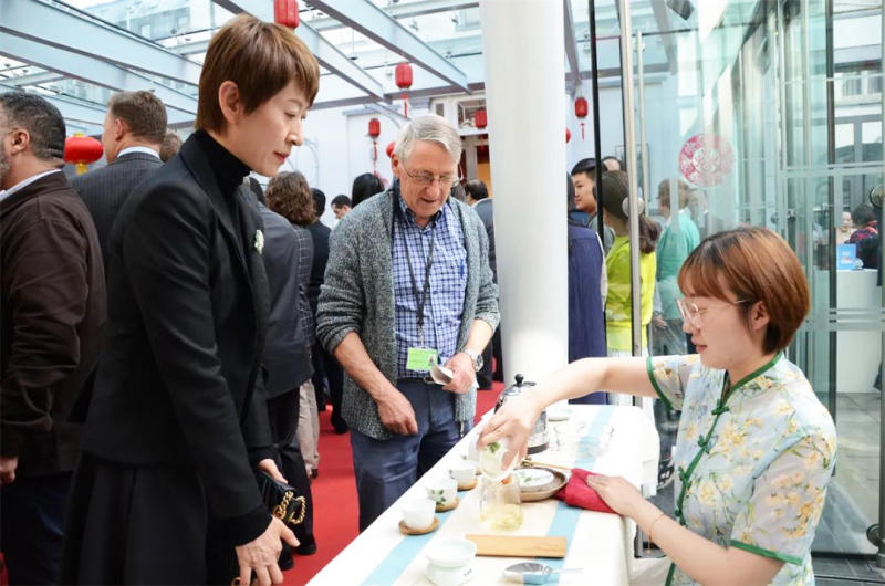 曹忠明大使在致辞中表示,中国的茶已有4700多年历史,它不仅蕴含着“人与自然和谐共生”的中华文化精神内涵,更是中国连通世界的重要纽带。2019年11月,第74届联合国大会宣布将每年5月21日设为“国际茶日”,这是对茶的经济、社会和文化价值的赞美。2022年11月,“中国传统制茶技艺及其相关习俗”被列入联合国教科文组织人类非物质文化遗产代表作名录,中国茶文化对世界文化多样性的贡献得到肯定。本次展览以茶为媒,表达着祈福天下和合的美好祝愿。