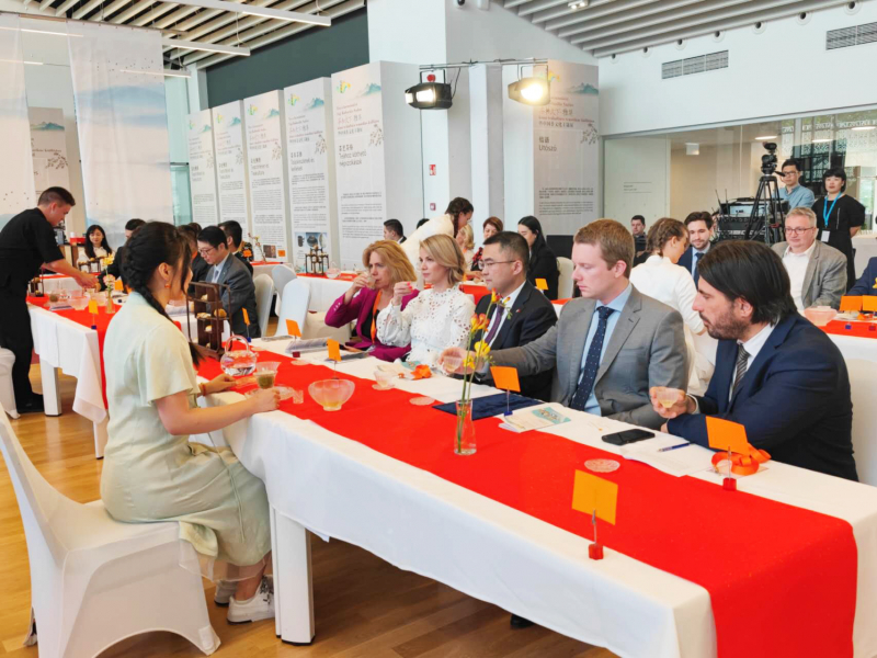 在现场,来自北京的“和香制作技艺”项目非遗传承人、中国民俗学会香文化专业委员会荣誉主任孙亮为嘉宾们主持香道;中国国家一级评茶师、浙江大学茶学系讲座教授戎新宇为嘉宾展示了茶道,并介绍西湖龙井、大红袍、正山小种三道名茶,并由此前接受培训的大学生志愿者们为宾客进行了面对面地冲泡茶技艺展示。随后,中匈两国的香道大师、茶文化专家与汉学家们,以香道与茶道的关系、中国茶文化内涵、茶文化在中匈两国的发展为题进行了一场“论茶”对话。嘉宾们“以茶会友”,体验了一场闻香、品茗、观展、听琴、论茶的“文雅之集会”。