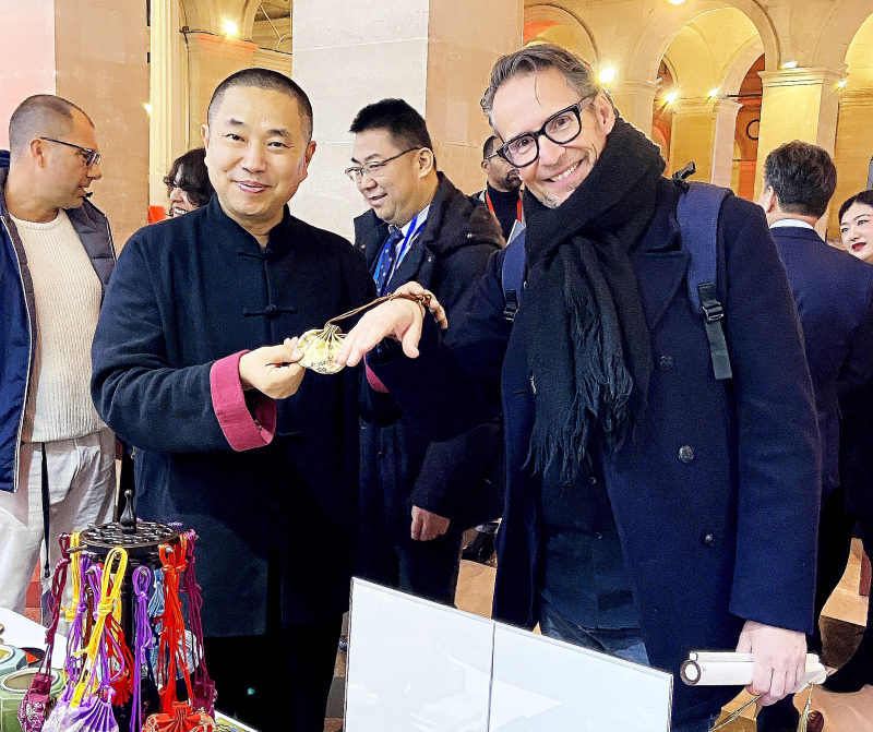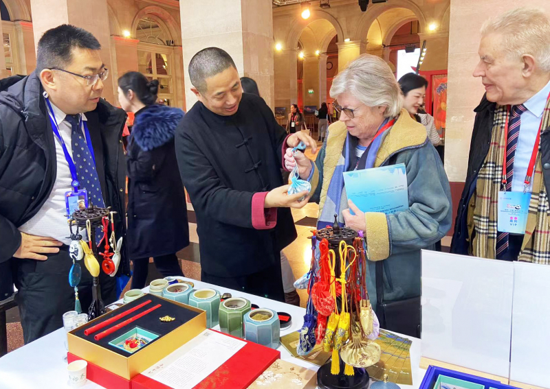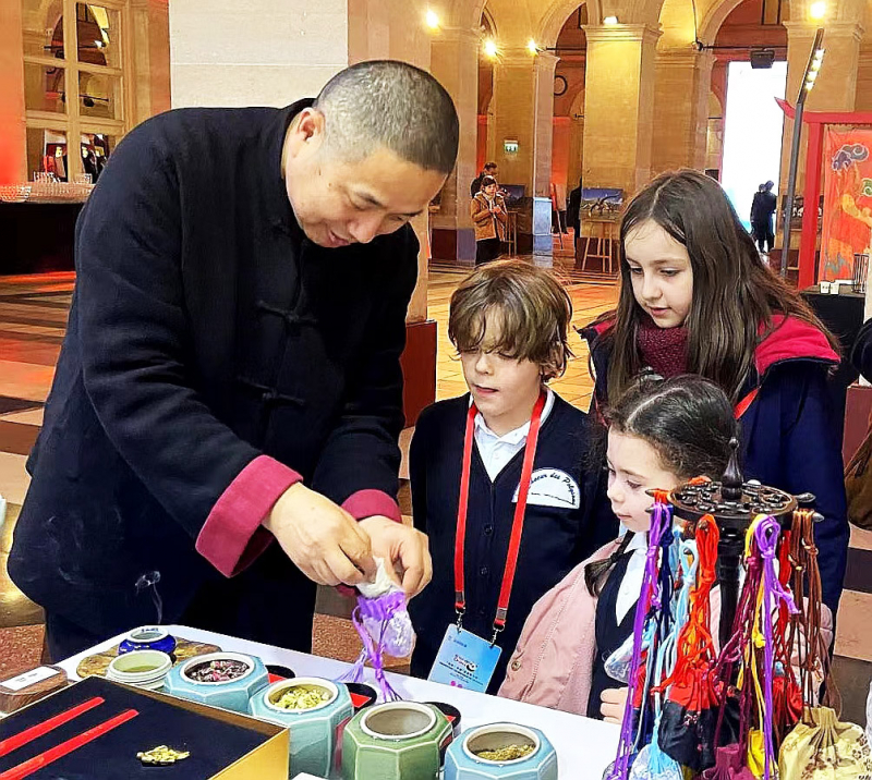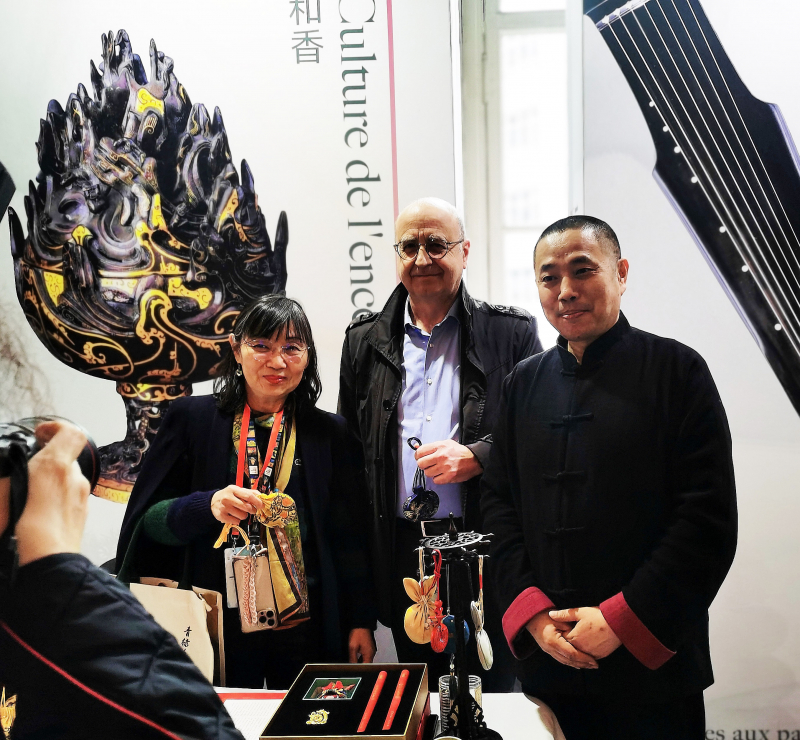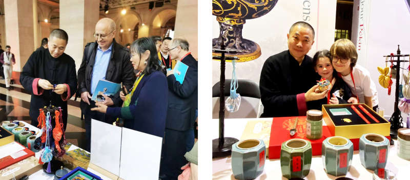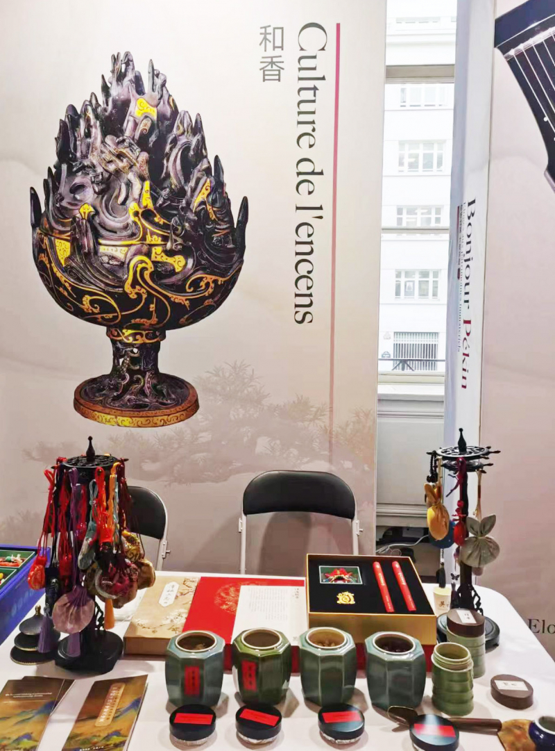1月30日,在法国巴黎布龙尼亚宫举行的“你好!中国”旅游推介会上,嘉宾体验和香制作。新华社记者 高静 摄