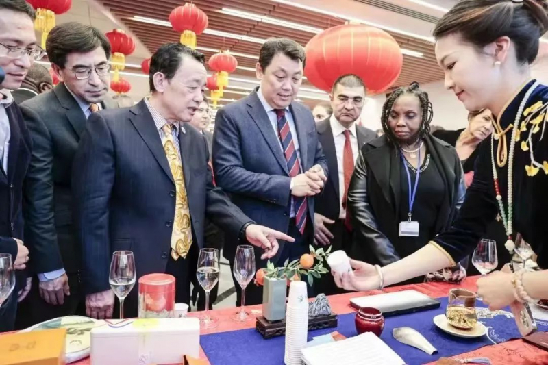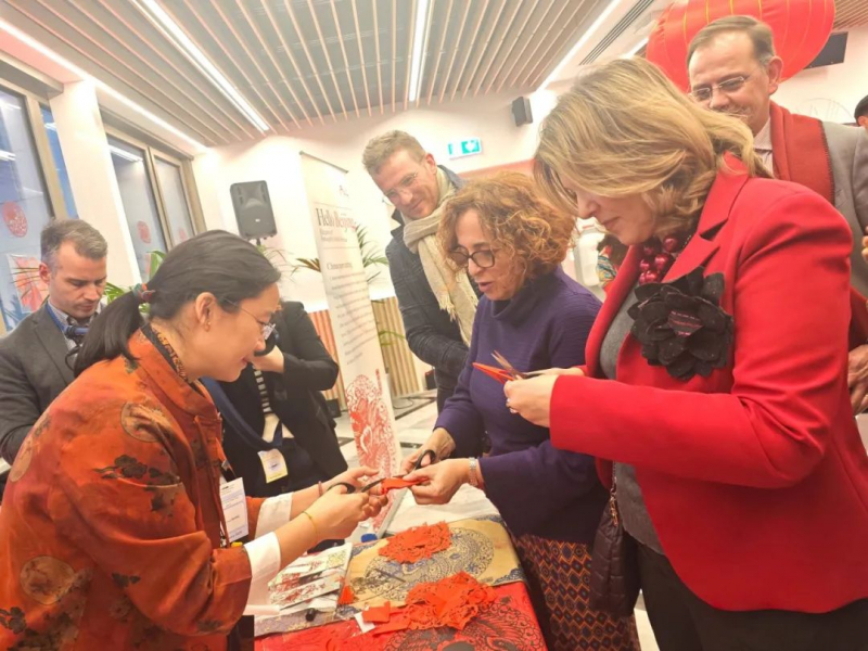 北京文化代表团在现场进行了太极拳、茶艺和剪纸等中国传统文化艺术表演展示,博得众人纷纷喝彩。与会嘉宾饶有兴趣地品茶、剪纸,对中国春节习俗和中国传统文化产生浓厚兴趣。