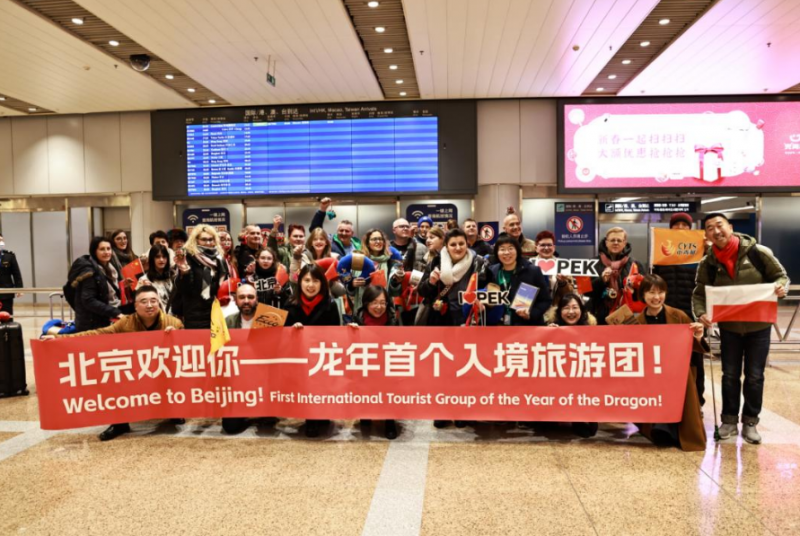 甲辰龙年大年初一,北京喜迎新春首批入境旅游团来京过春节。11时许,来自波兰的21名游客抵达首都国际机场。