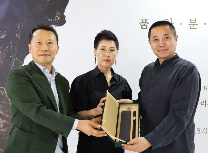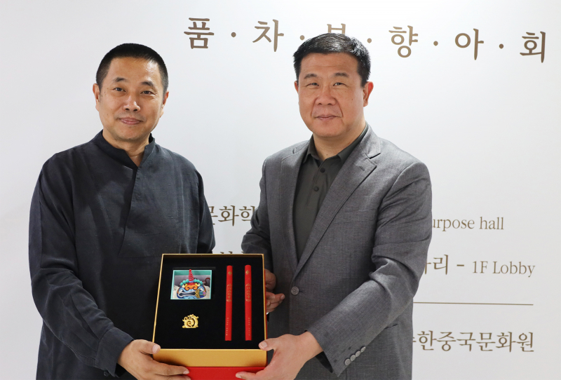 中国民俗学会香文化专业委员会荣誉主任,北京市级石景山区非遗项目"和香制作技艺”代表性传承人孙亮分别向首尔中国文化中心主任沈晓刚和韩国香道协会荣誉会长郑金丹、韩国香道协会理事长李相均赠送了非遗文创礼品。