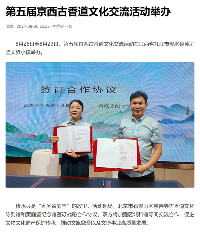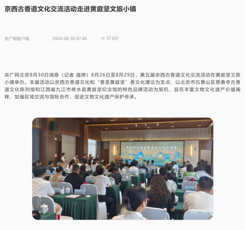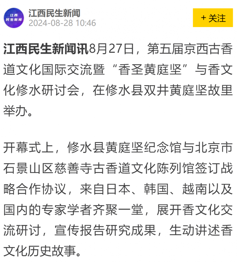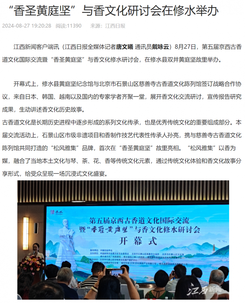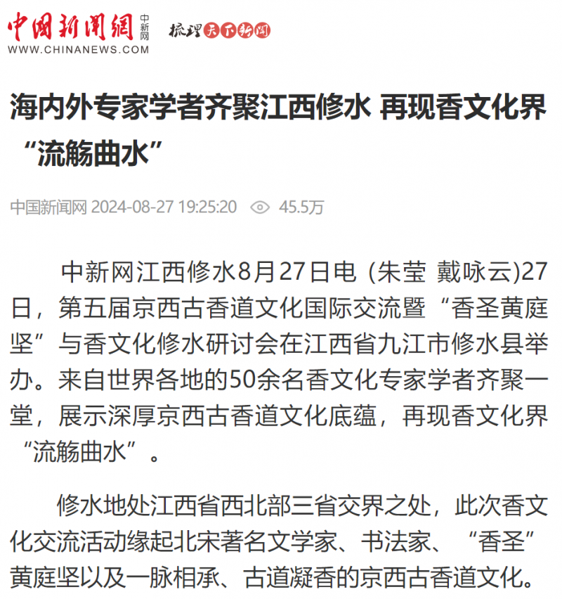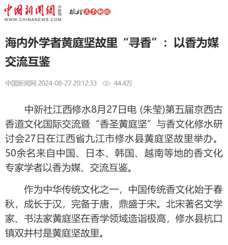 8月27日-29日,第五届京西古香道文化国际交流暨“香圣黄庭坚”与香文化修水研讨会,在江西省九江市修水县黄庭坚故里成功举行。此次盛会不仅吸引了来自德国、日本、韩国、越南及国内多地的香文化专家学者。相关新闻报道持续刷屏,引发了社会各界的广泛瞩目。中央及省级主流媒体纷纷聚焦,相关新闻报道持续占据各大平台,成为热议话题。