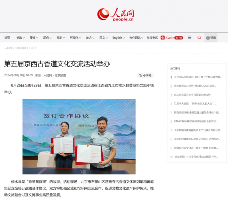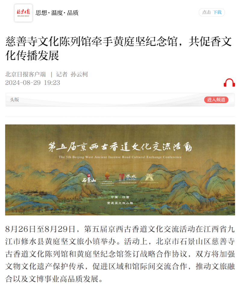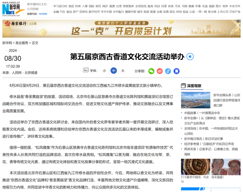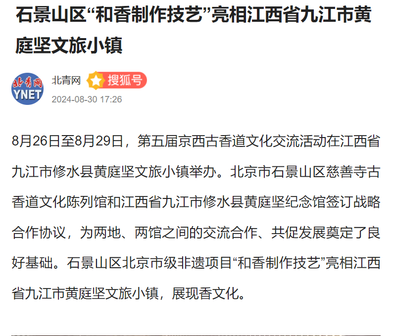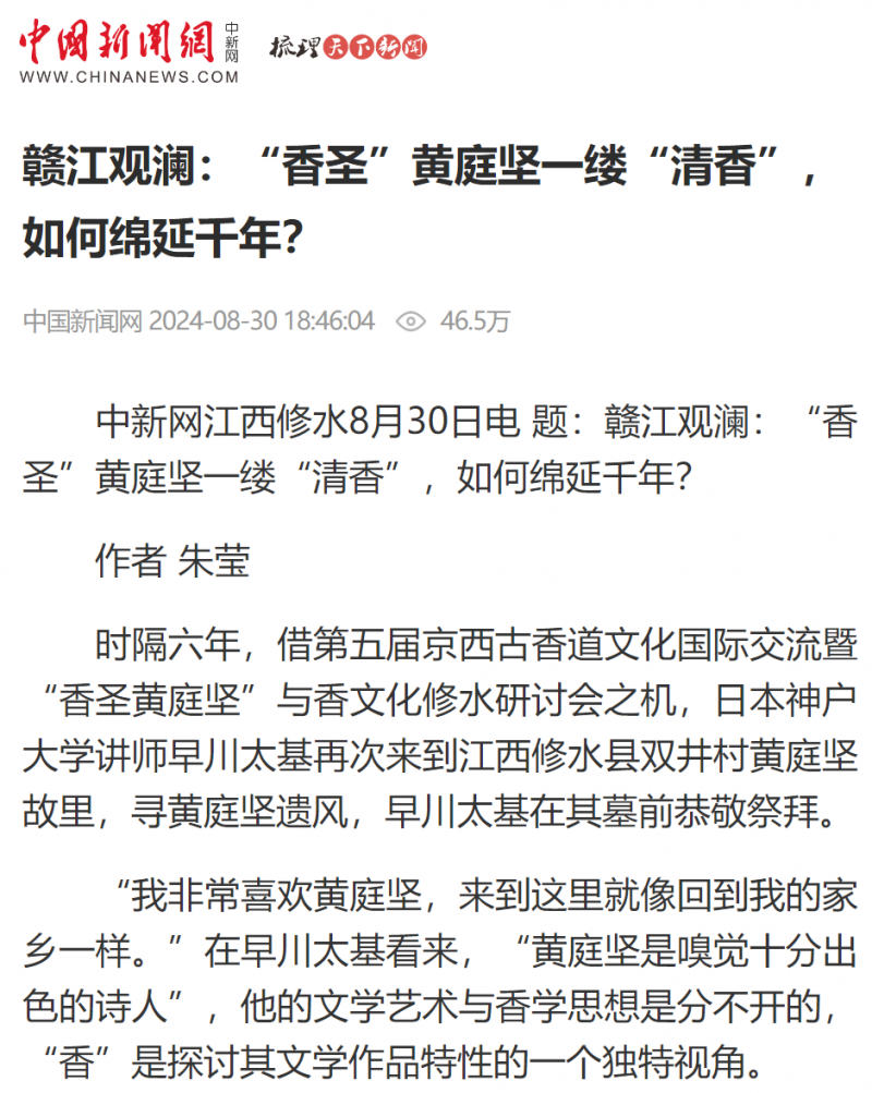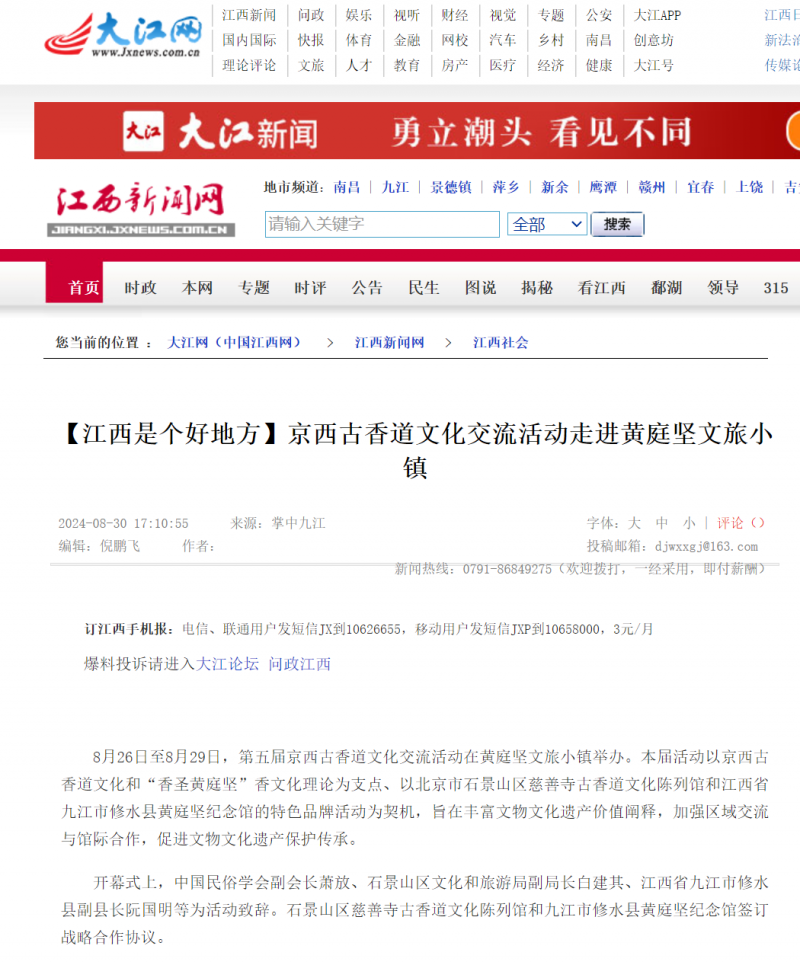 8月27日-29日,第五届京西古香道文化国际交流暨“香圣黄庭坚”与香文化修水研讨会,在江西省九江市修水县黄庭坚故里成功举行。此次盛会不仅吸引了来自德国、日本、韩国、越南及国内多地的香文化专家学者。相关新闻报道持续刷屏,引发了社会各界的广泛瞩目。中央及省级主流媒体纷纷聚焦,相关新闻报道持续占据各大平台,成为热议话题。