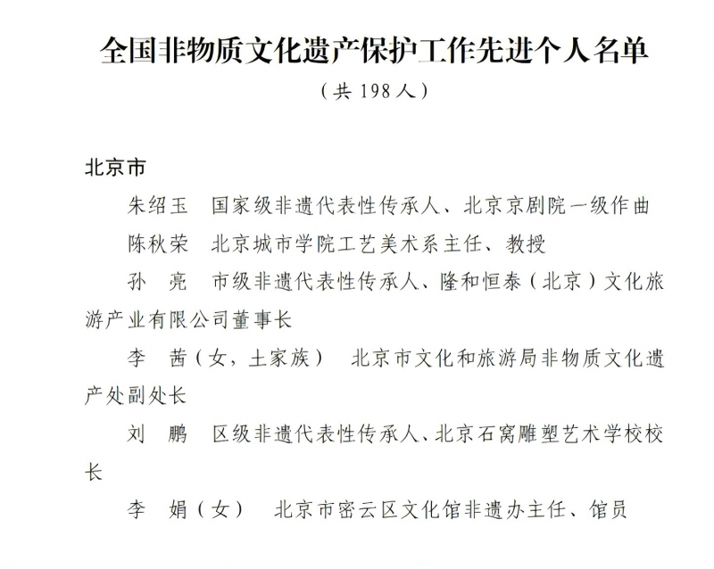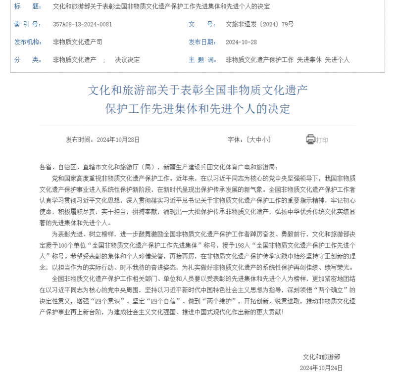 2024年10月28日,文化和旅游部官方网站发布《文化和旅游部关于表彰全国非物质文化遗产保护工作先进集体和先进个人的决定》,授予100个单位“全国非物质文化遗产保护工作先进集体”称号,授予198人“全国非物质文化遗产保护工作先进个人”称号,本次评选旨在进一步鼓舞激励全国非物质文化遗产保护工作者在非物质文化遗产保护传承实践中踔厉奋发、勇毅前行,守正创新、继往开来,为扎实做好非物质文化遗产的系统性保护再创佳绩、续写荣光。我区市级非遗代表性项目和香制作技艺代表性传承人孙亮荣获全国非物质文化遗产保护工作先进个人称号。