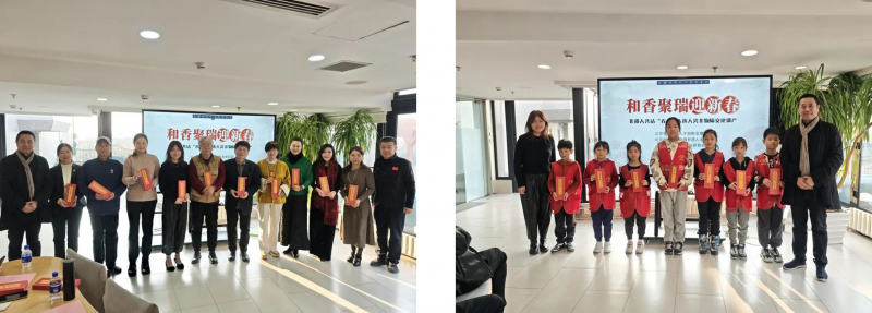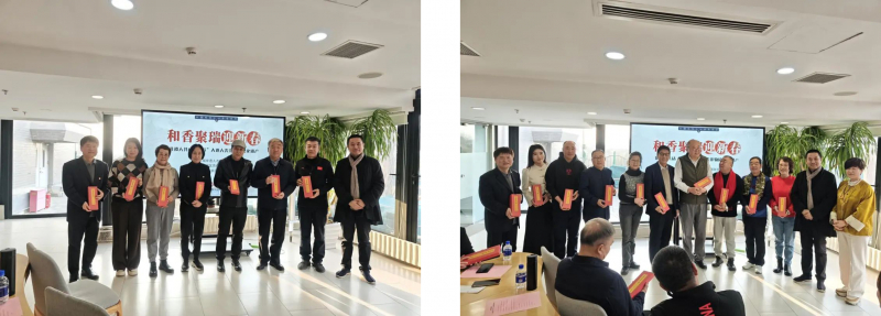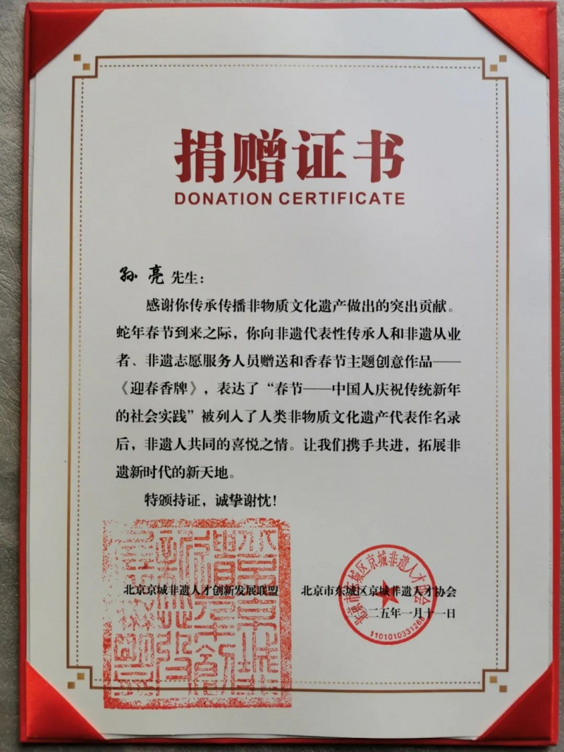 “和香制作技艺”代表性传承人孙亮详细介绍了春节创意作品《迎春香牌》,从灵感来源到制作工艺,每一个细节都蕴含着对春节文化的深刻理解。随后,孙亮将《迎春香牌》分别赠予非遗传承人、工作者和志愿服务队小队员,寓意非遗文化的火种在代际之间得以延续和传承。作为对孙亮杰出贡献的高度认可与诚挚感谢,非遗联盟向其颁发了捐赠证书。对收到这样一份承载着工匠精神、寄托了传承厚望、讲述着非遗故事的新年礼物,最激动的要数几位来到现场的小志愿者了。他们在一年以来的非遗志愿服务活动中,不仅体会了奉献的快乐,更收获了非遗的知识。这样的一场迎新会,更激发了他们新年志愿服务的积极性和动力。