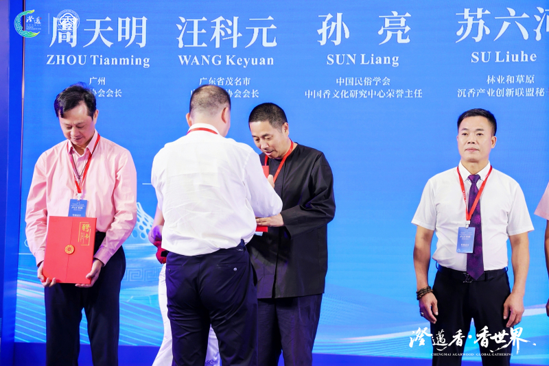 现场为全国首届沉香文创大赛获奖者颁奖。